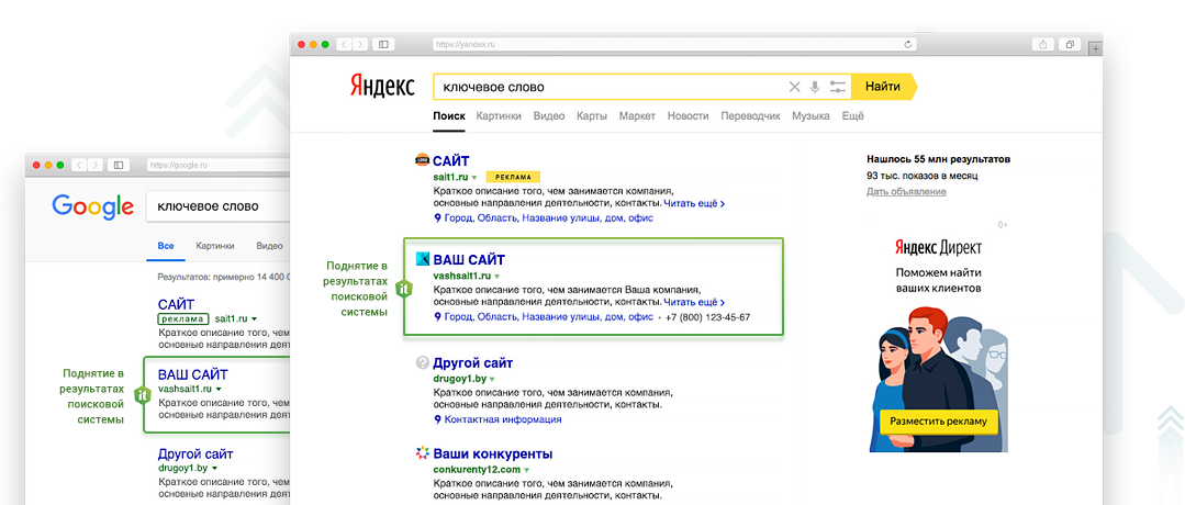 - нахождение на 1 странице поисковых систем дает органический трафик, то есть потенциальных Клиентов